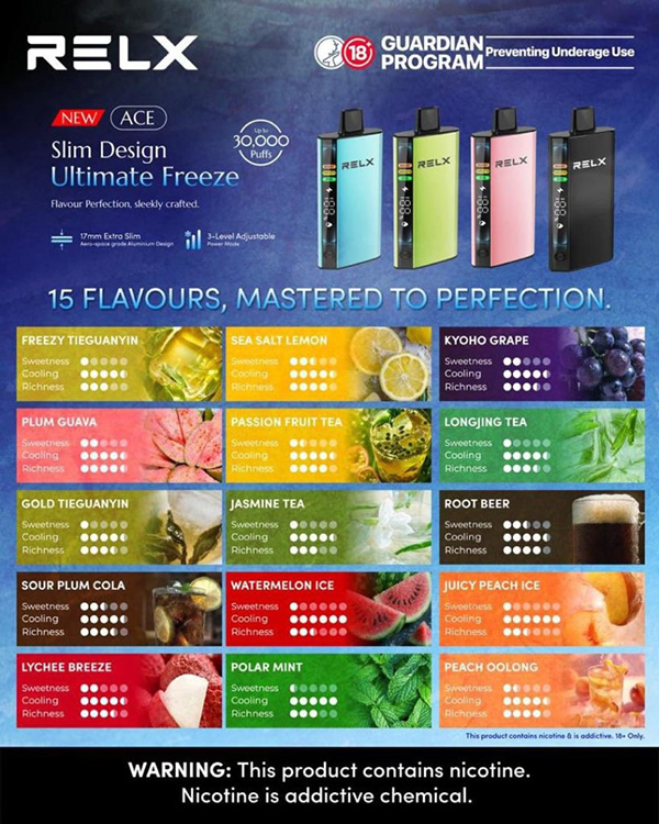 正品悦刻RELX ACE 30000口是由 RELX 悦刻生产的高口数一次性电子烟,主打 "超长使用次数" 和 "便捷性",其厚度仅仅17mm,非常易于携带。RELX ACE 30000口一次性电子烟具有非常独特的航空级铝材材质外观,坚固耐用,酷炫炸!其因超大的预装油量和出色的口味而闻名于世,稳定的双网丝结构,极大地提升雾化效率和口感还原度。此外,悦刻RELX ACE 30000口提供Boost (强劲)/Smooth (顺滑)/Eco (节能)三种功率模式调节,用户可根据不同偏好通过按键切换选择。其正面的智能液晶显示屏能小时火力与工作模式,电量和剩余烟油含量,让您掌控每一口的顺畅享受!