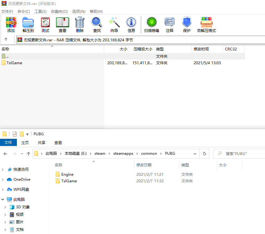 第二步 :打开PUBG这个文件夹,把压缩包里的文件夹拖拽下来替换文件就行了